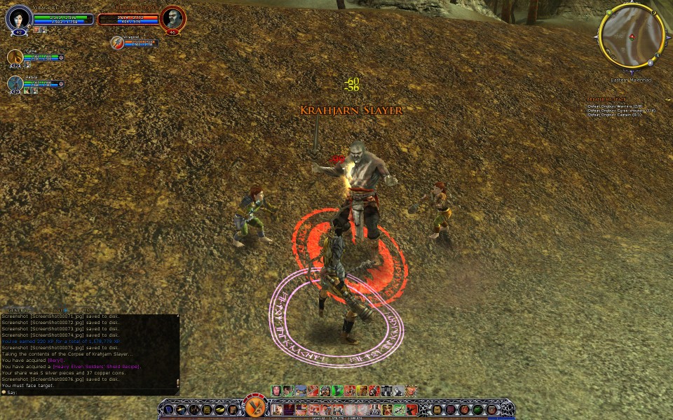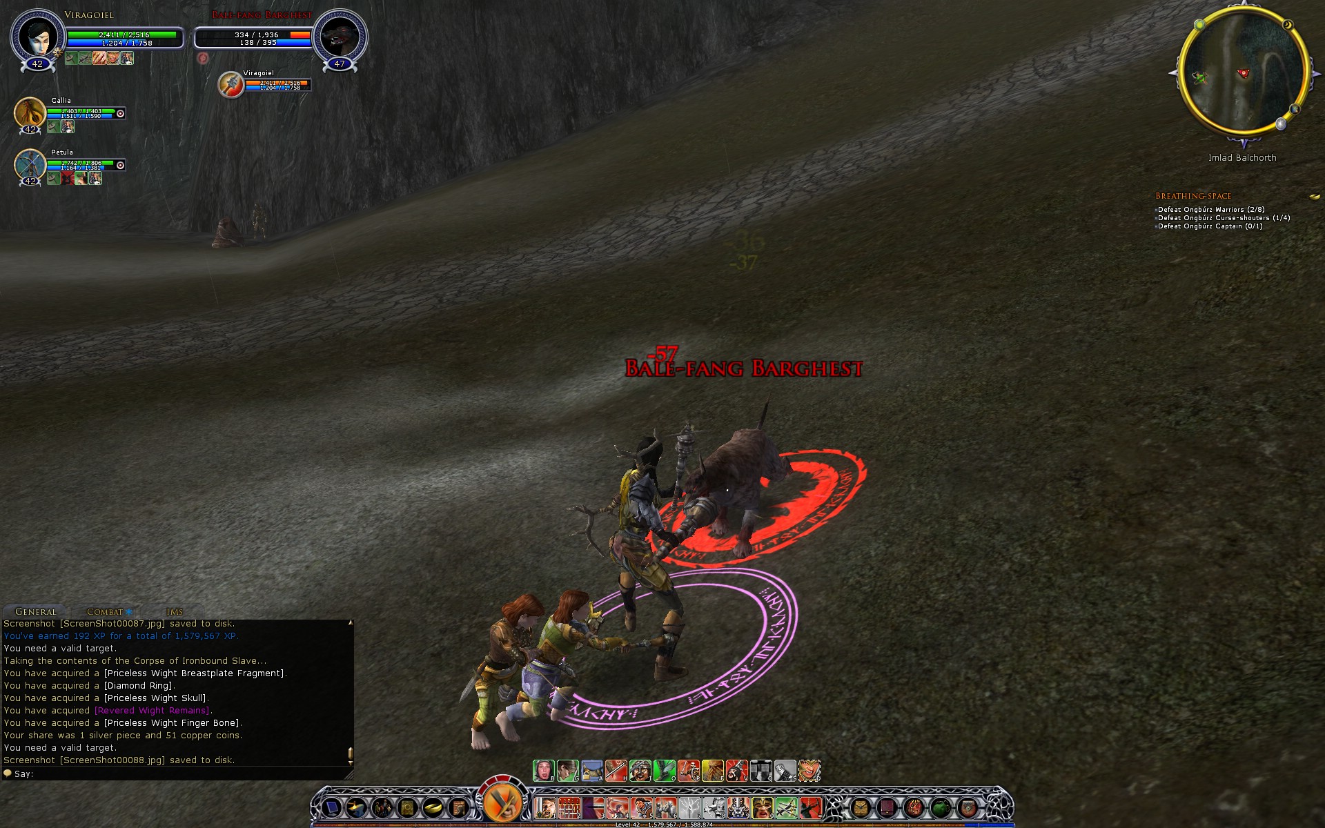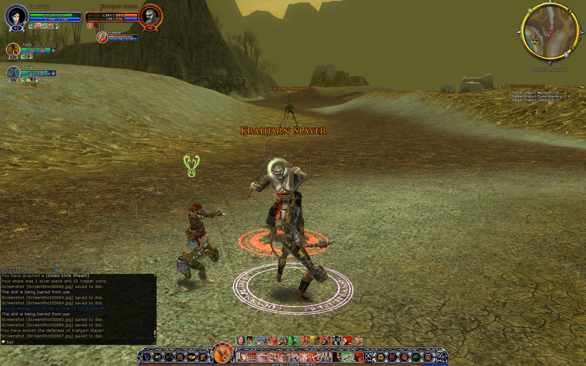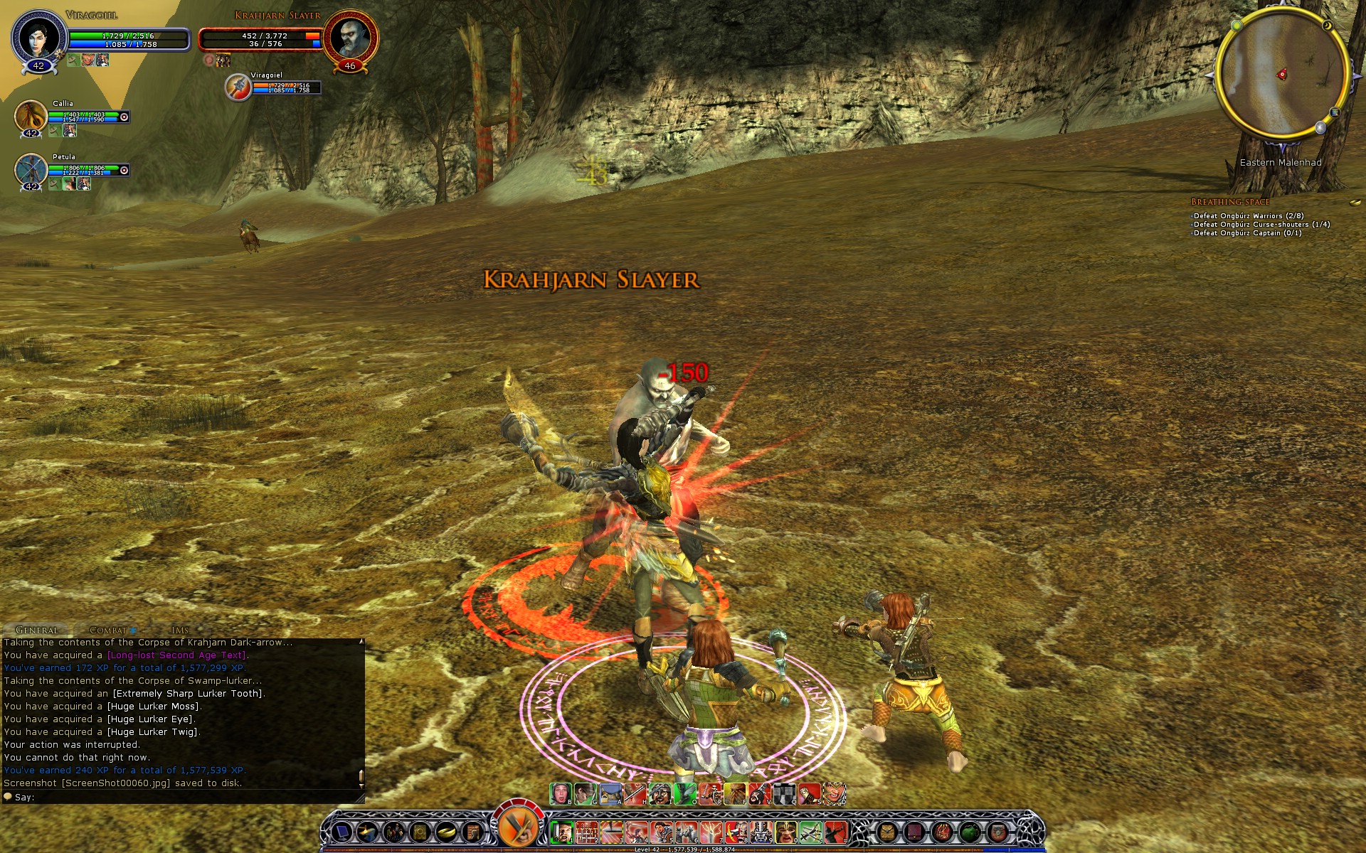 Having killed several armies' worth of Orcs over my 42 levels, it was nice to finally find an Uruk Hai! 8-) This particular chap is a level 46 Signature mob, just at the top of the Orange Con range, but an easy enough victim for my trio. As usual, the Elf Champion is front and centre, cheerfully swiping away, while the other two hide behind her and take occasional cautious pot shots.