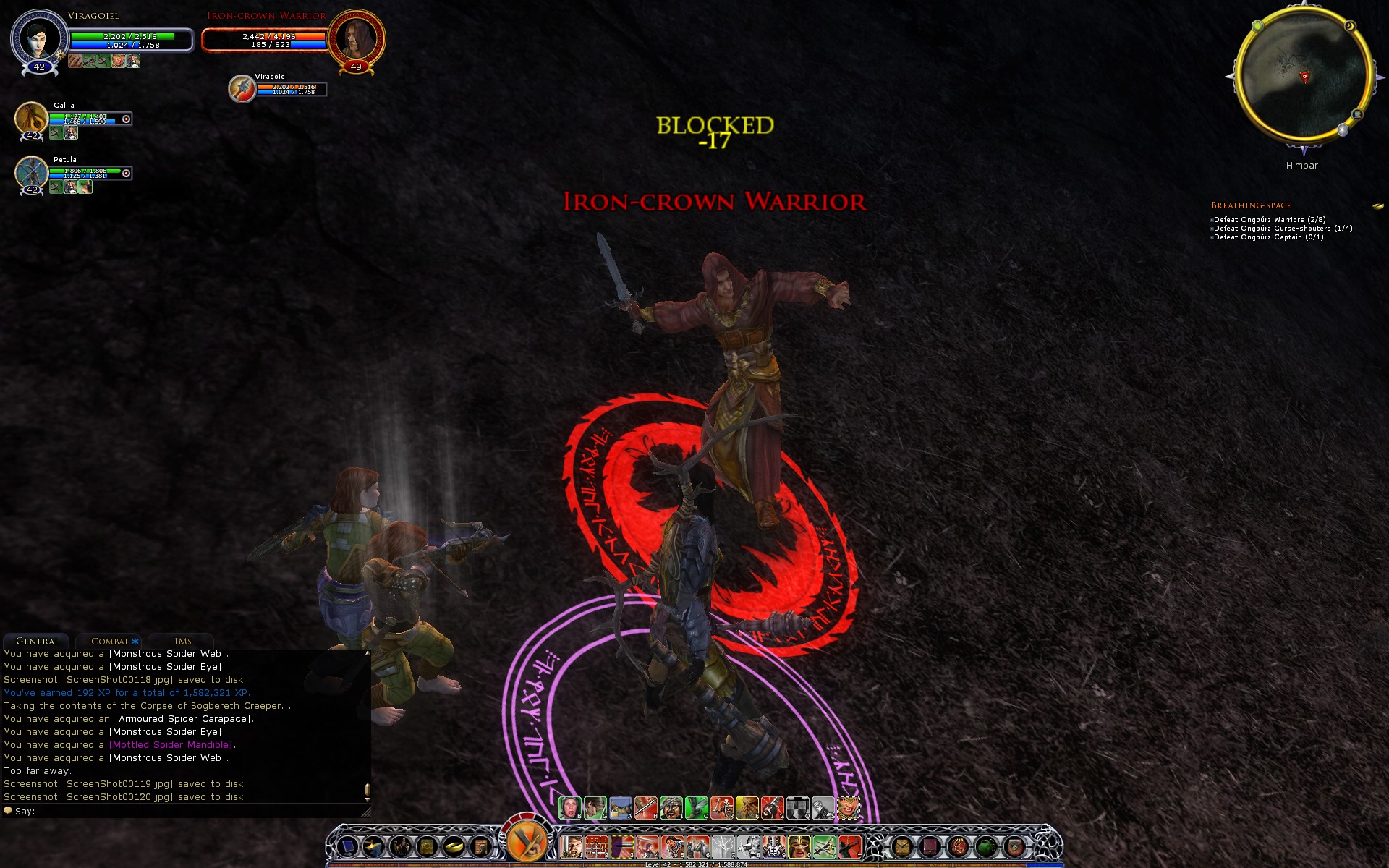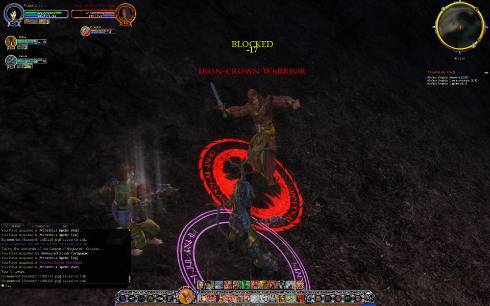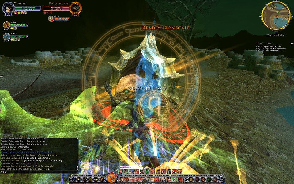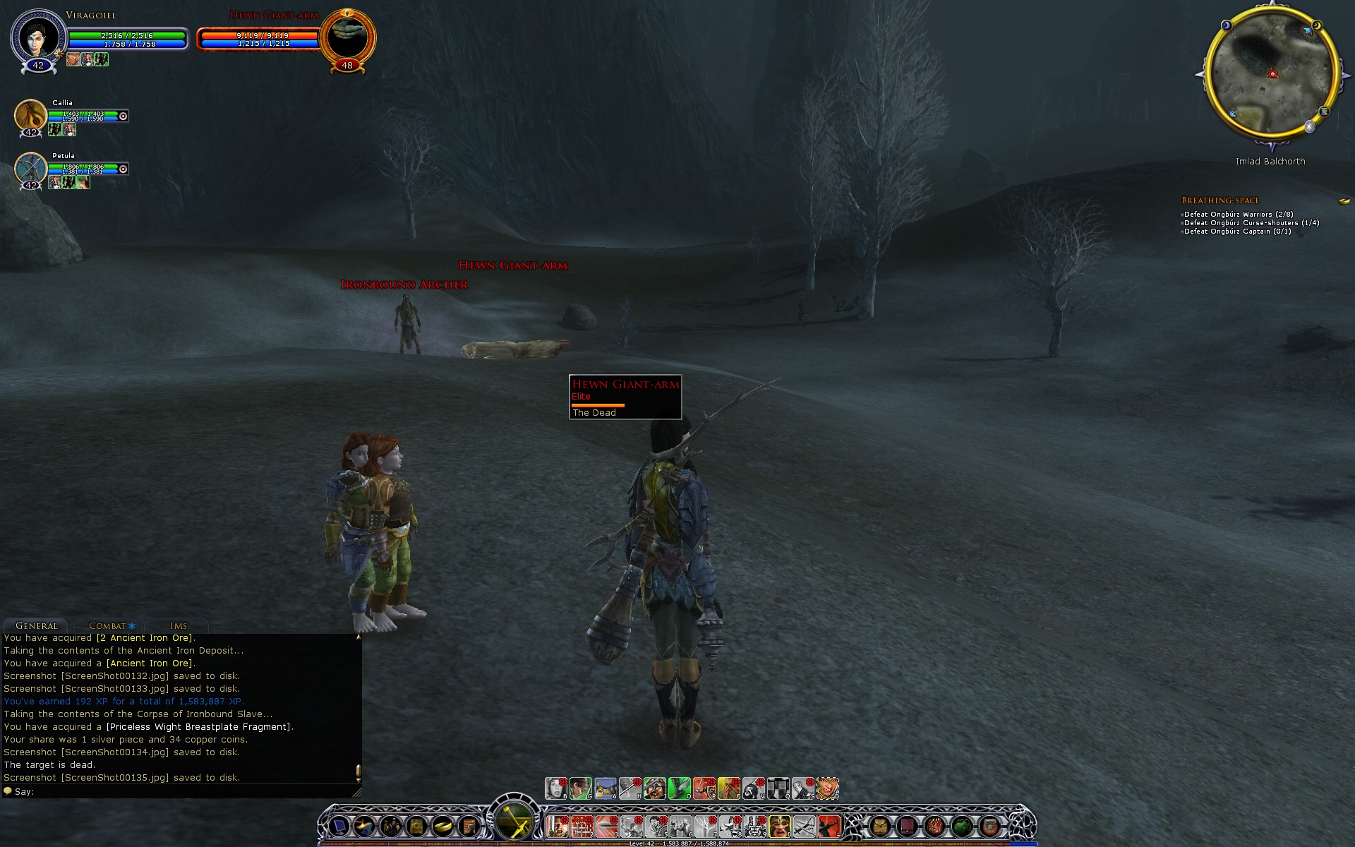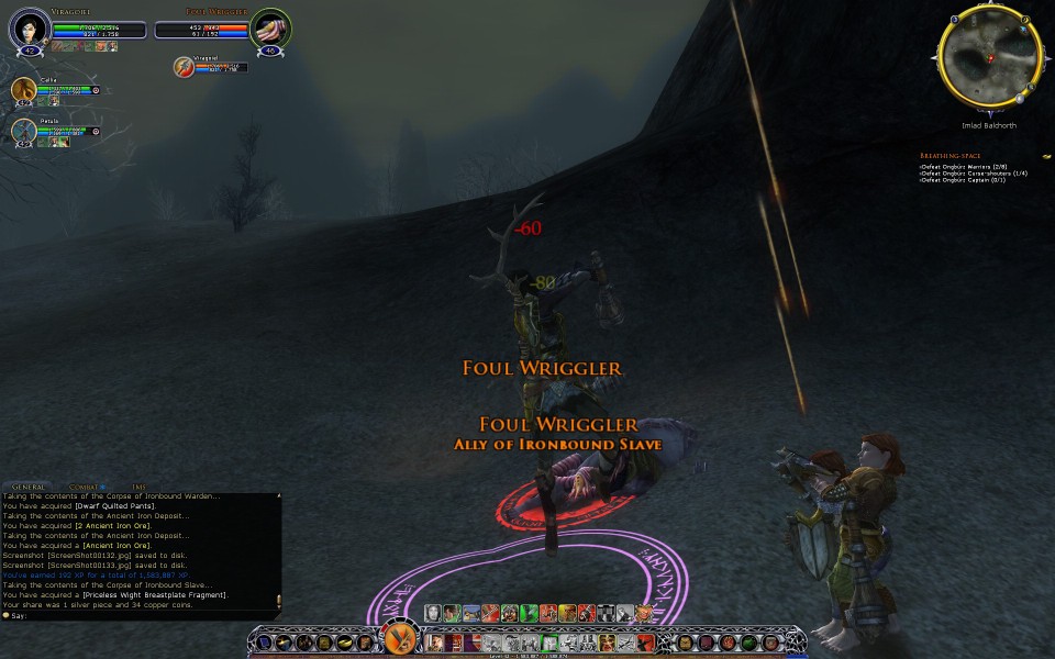 Having killed several armies' worth of Orcs over my 42 levels, it was nice to finally find an Uruk Hai! 8-) This particular chap is a level 46 Signature mob, just at the top of the Orange Con range, but an easy enough victim for my trio. As usual, the Elf Champion is front and centre, cheerfully swiping away, while the other two hide behind her and take occasional cautious pot shots.