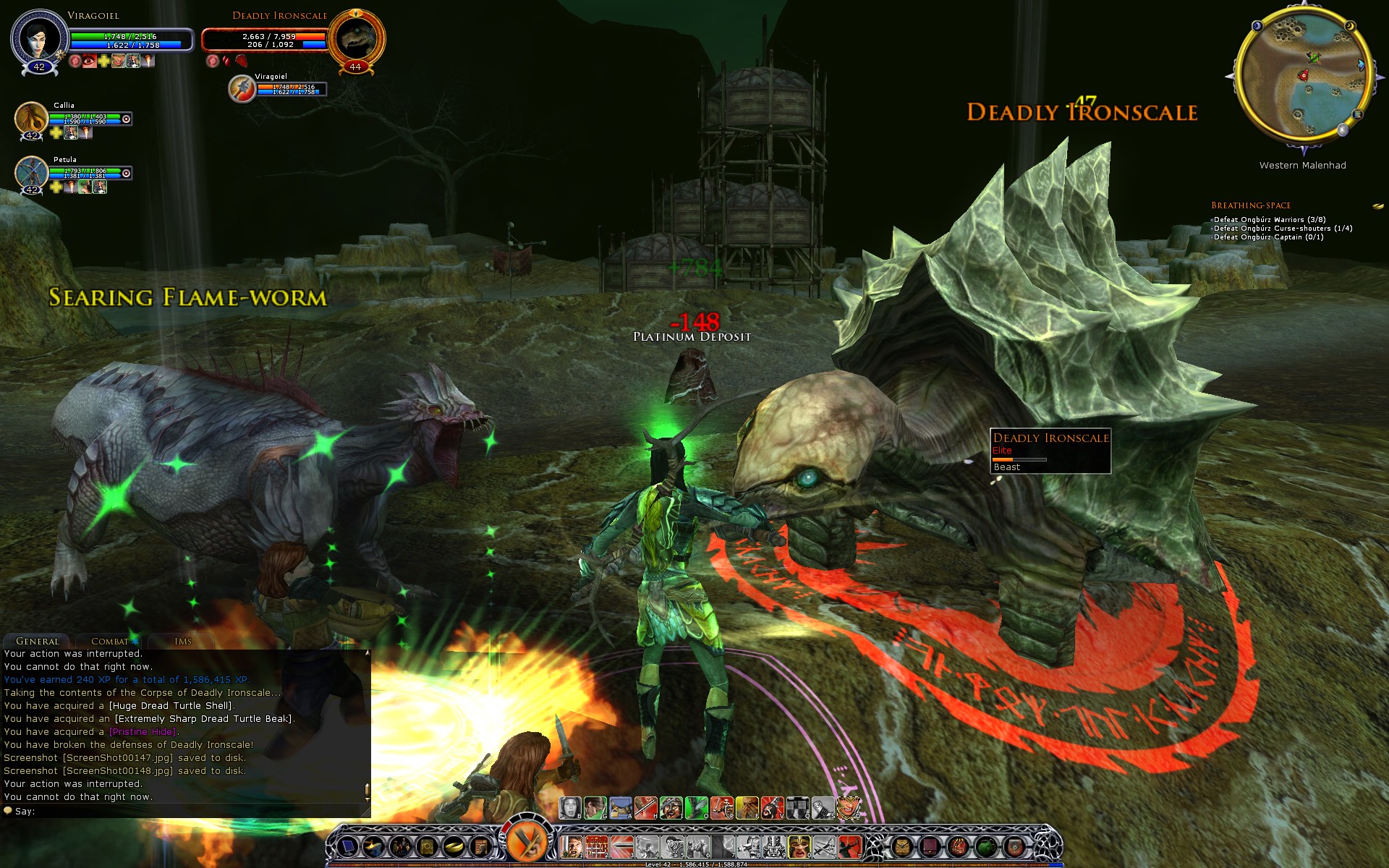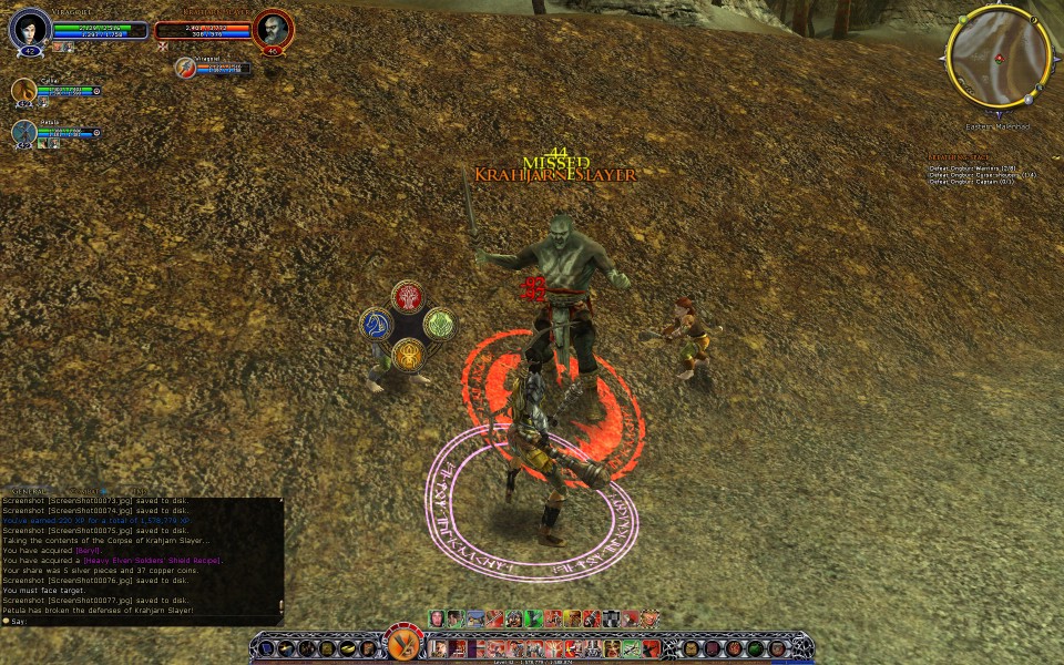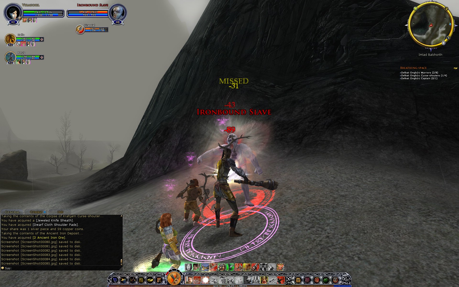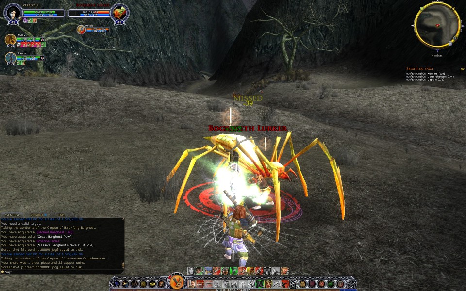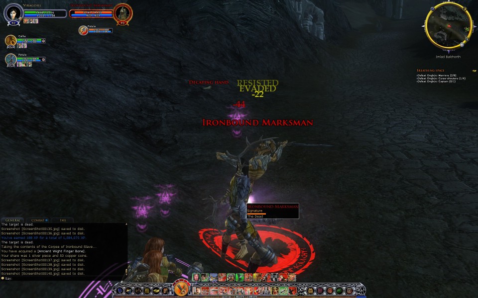 Having killed several armies' worth of Orcs over my 42 levels, it was nice to finally find an Uruk Hai! 8-) This particular chap is a level 46 Signature mob, just at the top of the Orange Con range, but an easy enough victim for my trio. As usual, the Elf Champion is front and centre, cheerfully swiping away, while the other two hide behind her and take occasional cautious pot shots.