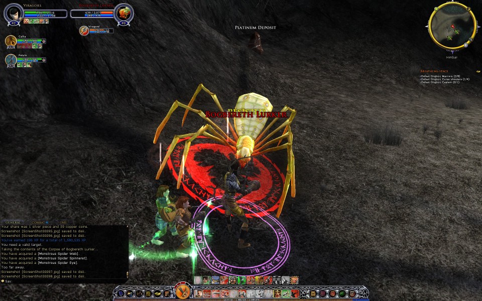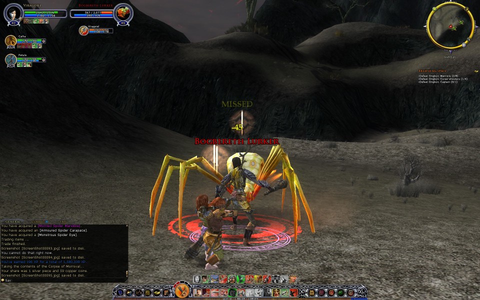 EEP!!! I got jumped by a Level 49 Spider, that's 7 levels above me, and only one level away from being a Purple Con! Still dispatched it fairly easily though, mostly through a combination of missing and chipping away with low hits 8-)
